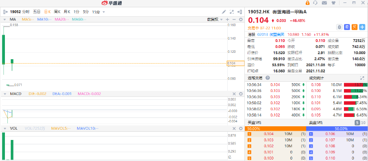 相关涡轮方面,微盟海通—甲购A $19052.HK 涨46%,其行使价为15.82港元,到期日为2021年11月8日,溢价53.55%。