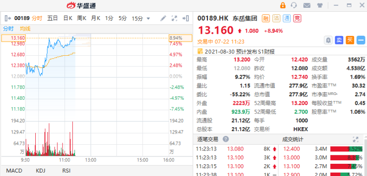 华盛资讯7月22日消息,数据显示21日,主流地区有机硅DMC均价30633元/吨,较14日上调67元/吨,自年初以来累计涨幅约40%,受消息刺激,东岳集团早盘再度破顶,截止发稿,东岳集团上涨8.94%,现报每股13.16港元gang'yuan%,股,总市值277.9亿港元,成交额4.538亿港元,换手率1.69%。价高见13.20港元