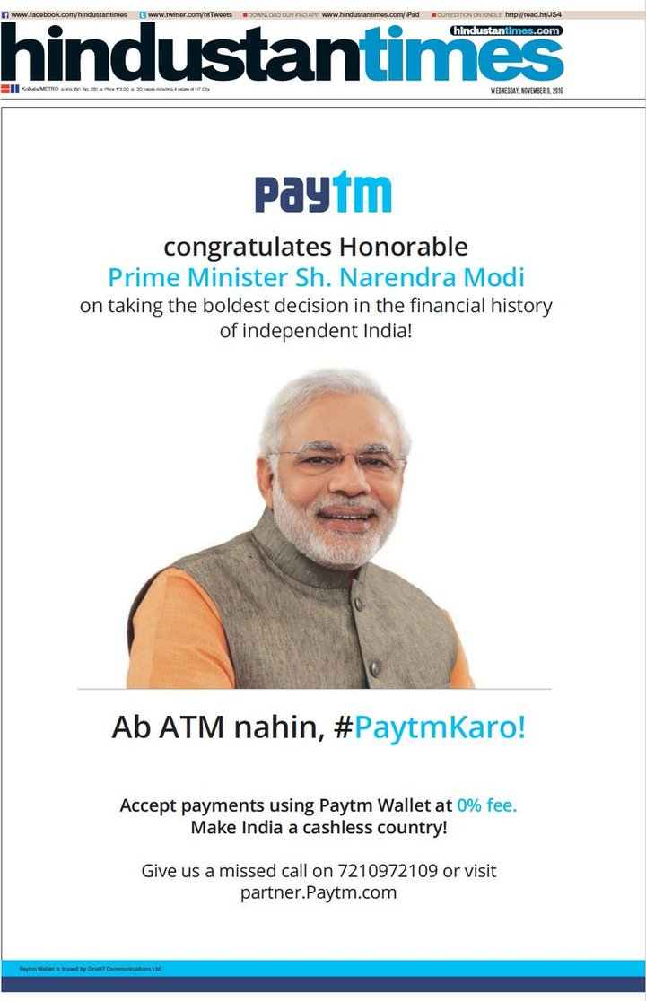随着2015年的到来,印度总理纳伦德拉莫迪(Narendra Modi)推出了“数字印度”计划后,Paytm才有了现在这样的规模。这一举动也催生了很多随互联网巨头的诞生,此后,一场“废钞行动”也让Paytm得到了助力。