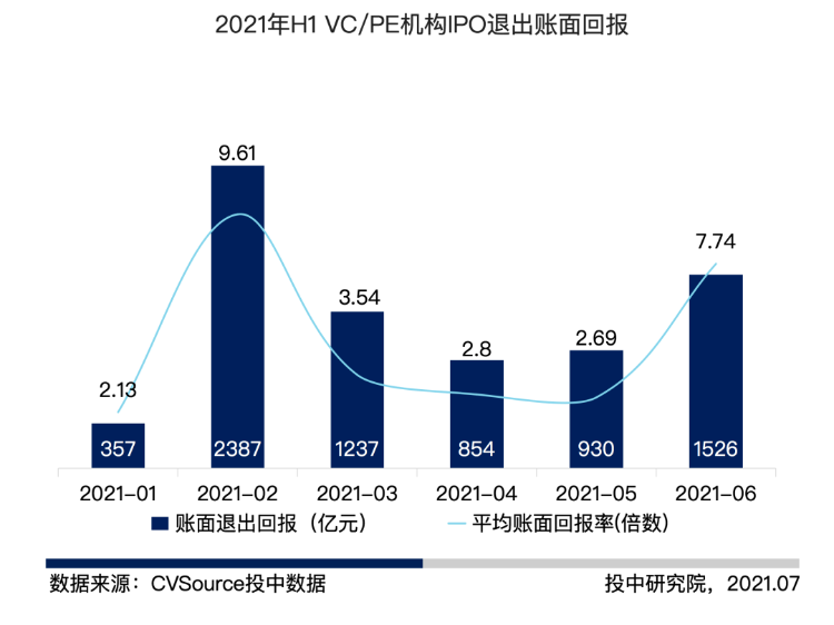 2021年H1,VC/PE机构IPO账面退出回报总规模为7291亿元,主要集中在2月和6月,平均账面回报率小幅波动。