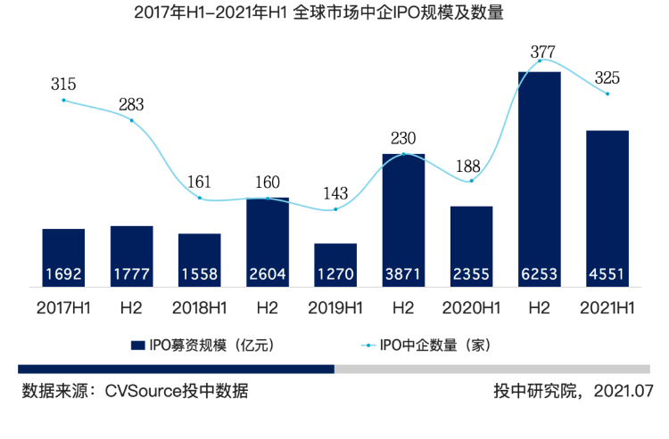 2021上半年,共计325家中国企业在A股、港股以及美股成功IPO,同比上升72.87%, 环比下降13.79%,募资总额4551亿元,同比上升93.25%,环比下降27.22%;整体看来,2021年上半年IPO市场活跃,全球募资总额较去年同期增加近2倍,预计下半年IPO市场仍将蓬勃发展。