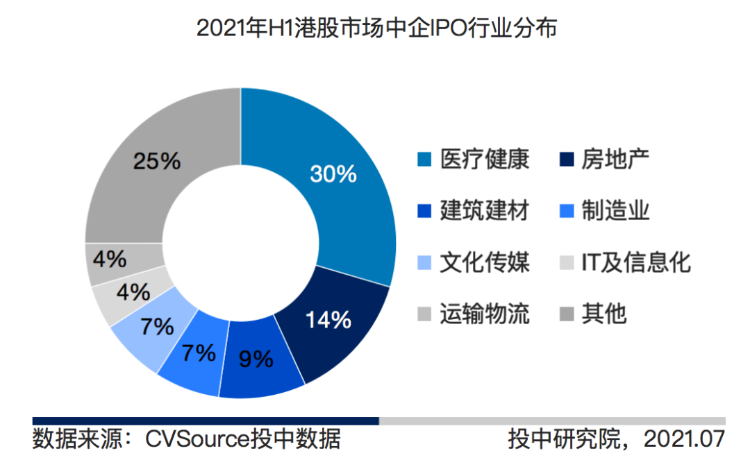 2021上半年,有44家中国企业在香港IPO,IPO数量较去年同期下降10.02%,募资金额共计1574亿元,较去年同期上升1.14倍。受市场流动性充足及经济逐步复苏的影响,上半年中企赴港上市的数量较同期虽有小幅下跌,但得益于快手(01024.HK)、京东物流(02618.HK)等多家大型公司的助力,IPO募资总额较去年同期增长1倍多。2021年H1,港股市场中企IPO行业分布中,医疗健康及房地产行业占主导,前者较去年增长6家,其他行业均略有减少。