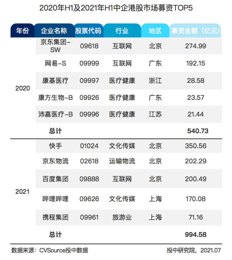 2021上半年,港股市场IPO募资规模的TOP5的行业及地区分布较去年差异明显,2021H1中企港股IPO募资TOP5中,文化传媒占据3席,而去年互联网及医疗健康两大行业表现凸显;去年分布地区较为分散,而今年地区聚焦在北京和上海两地;整体来看,IPO募资TOP5合计募资规模较去年上涨83.83%,同时,排在首位的快手募资规模也远超于去年的京东集团-SW。