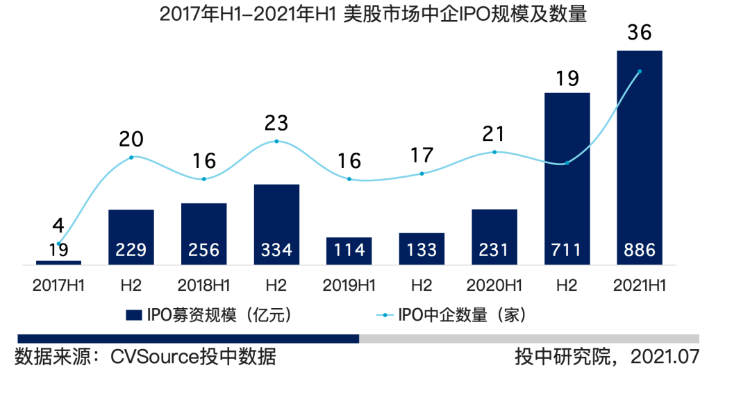 2021上半年,共36家中企在美国资本市场IPO,IPO数量同比上涨71.43%,募资金额共计886亿元 ,IPO规模同比翻2倍,环比上涨24.61%。上半年中企美股IPO主要集中在3月和6月,受美国财政刺激政策和新冠病毒疫情的缓和等影响因素,中企美股IPO市场逐步复苏,整体IPO数量规模较同期均有所上涨。
