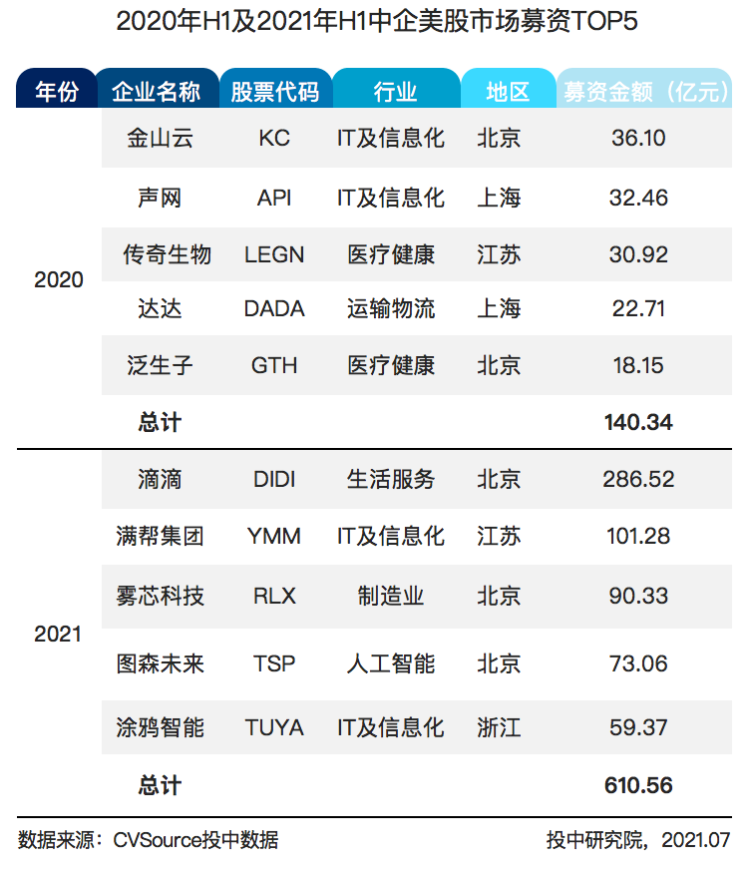 2021上半年,美股市场IPO募资规模的TOP5的行业分布较去年差异明显,主要分布在TMT行业,除与去年一致的北京,江苏地区,上海也入围在列。IPO募资规模均超过50亿元,相较之下,2020年H1 A股IPO募资规模TOP5均远低于50亿元,中企美股IPO募资TOP5合计募资规模较去年同期上涨三倍多,位居第五名的涂鸦智能募资额比2020年H1中企美股市场募资首位的金山云多出20亿元。