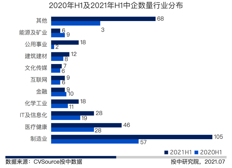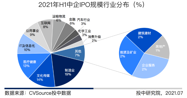 2021上半年,制造业、医疗健康、IT及信息化类公司IPO募资较多,占据各行业募资总额的36.86%,三个行业涉及的上市公司代表分别是雾芯科技、昭衍新药及满帮集团;制造业公司共有105家企业IPO,成为IPO数量最多行业。与去年同期相比,制造业呈大爆发式增长,医疗健康等行业也紧随其后。