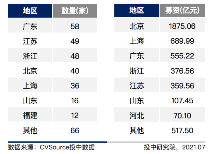2021上半年,前十大IPO项目的募资规模均在70亿元以上,占H1整体募资39%,TMT行业成为主流。其中,北京地区的IPO募集规模霸占前五席。