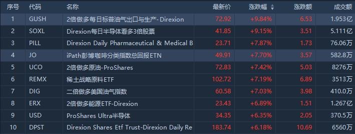 ETF涨幅榜方面,涨幅居首位的是 $GUSH 2倍做多每日标普油气出口与生产ETF涨近10%,成交额1.95亿美元。 $UCO 2倍做多原油ETF涨7.42%,成交额8276万美元。
