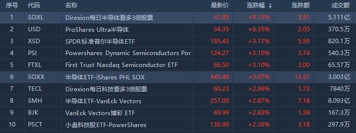 ETF涨幅榜方面, $SOXL 每日半导体看多3倍股票ETF涨9.15%,成交额5.11亿美元; $TECL 每日科技看多3倍股票涨近3%,成交额7840万美元。
