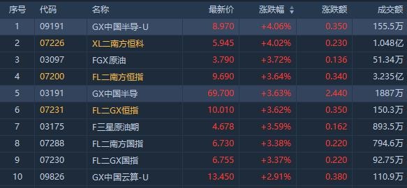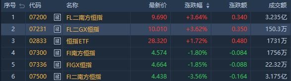 涨幅居前的是南方两倍看多恒指(07200.HK)涨3.64%,成交额3.24亿港元。