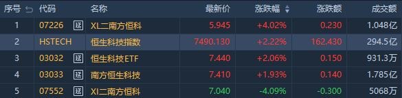 看多恒指相关ETF大涨,南方两倍做多恒科(07226.HK)涨4.02%,成交额1.05亿港元;