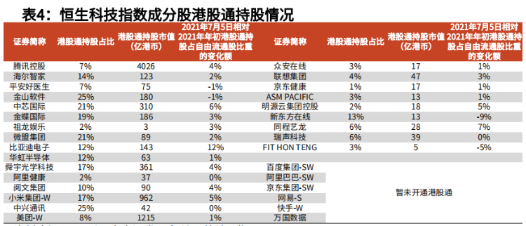 从港股通资金上看,尽管上半年恒生科指表现不佳,但南下资金在科指成分股仍然呈现净流入状态,截至2021年7月5日恒生科技指数公司净流入1355亿元港币,占比港股通总流入30%,显示中长期前景信心。
