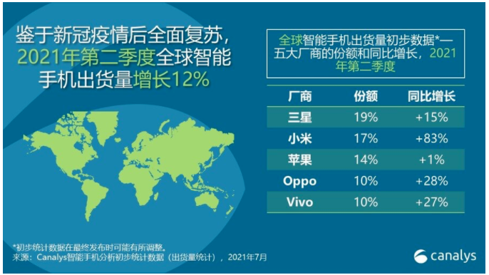 Canalys 2021年第二季度的统计中,第一名的三星手机市场份额为19%,与第二名的小米仅相差2%,而苹果以14%的份额名列第三,OPPO和vivo的份额同是10%,分列四五名。