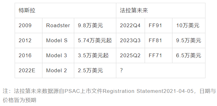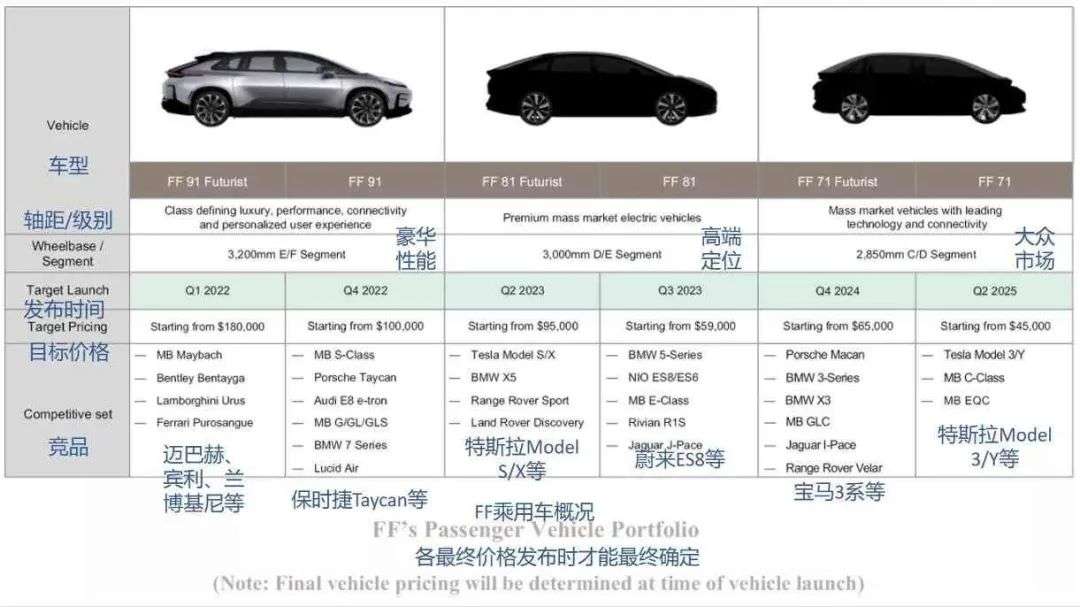 简单梳理FF乘用车车型的路线图,不难发现FF在对标特斯拉,从高端慢慢向下渗透至大众市场。
