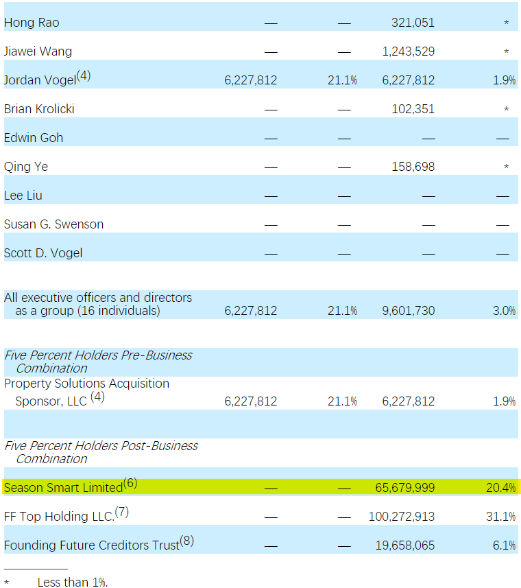 根据6月21日PSAC提交的S-4修改文件,此次PSAC与FF合并交易后,恒大集团子公司香港时颖(Season Smart Limited)将拥有新FF20.4%的股权;新FF也将获得10亿美元注资,为量产FF91车型提供资金保障。