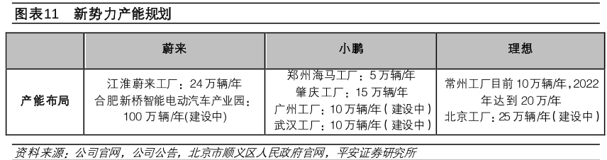 目前,江淮蔚来工厂的产能为年12万辆,且还在扩产中,预计年底可达单班15万、双班30万的产能。小鹏和理想则在汽车销量达到3万辆以后,选择自己建厂或者直接收购代工厂,据悉小鹏已坐拥4家工厂,年产能合计达47万辆;理想常州工厂年产能也预计在2022年翻番至20万辆。