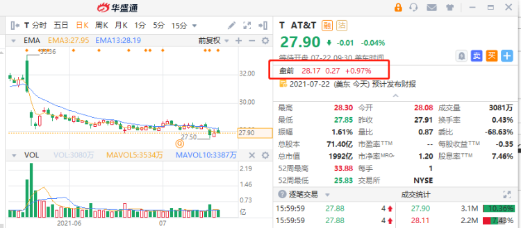 AT&T(T)公布财报后,盘前涨1%。