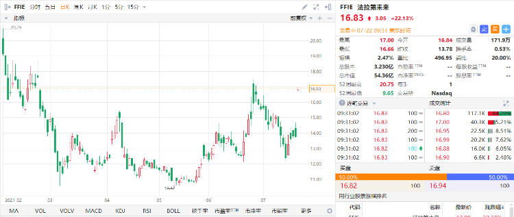 截至发稿,法拉第未来涨22.13%,报16.83美元。