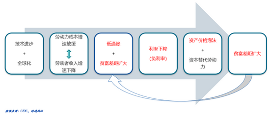 当越来越多的钱流向富人,资本就会更多地倾向于储蓄投资而不是生产消费,所以资本市场就会出现流动性过剩和资产荒。于是利率就会下降,借贷成本变低,更多的劳动力将被资本替代,贫富差距又进一步扩大。