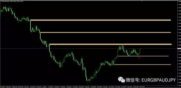 这个大实体阳线是对前期崩溃式下跌起点的突破,突破后遭到更高一级的大阴线实体顶部阻力的打压,于是美加在这个区间构筑成一个箱体。