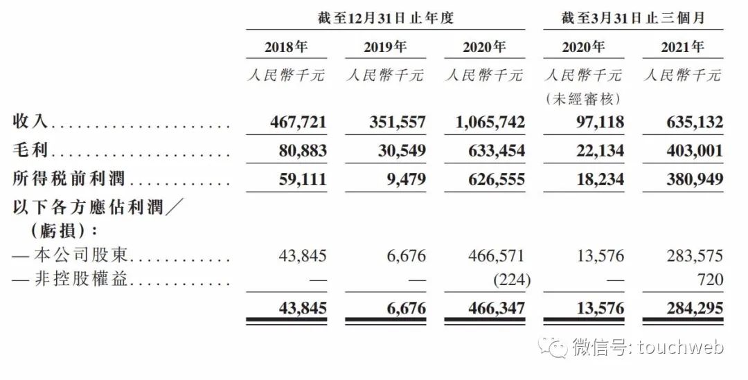 华源医疗2018年、2019年、2020年毛利分别为8088万元、3055万元、6.33亿元;华源医疗2021年第一季毛利为4亿元,上年同期的毛利为2213万元。