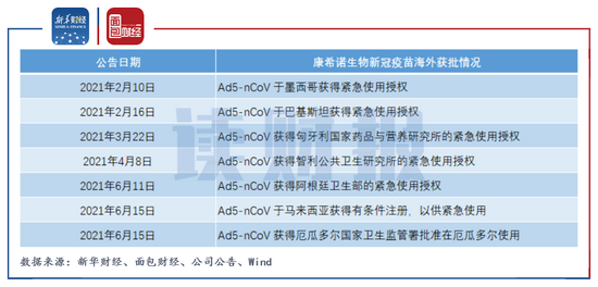 获批国内上市的同时,康希诺生物的新冠疫苗还获得了多个国家的紧急使用授权。根据不完全统计,2021年2月至6月期间,公司已获得墨西哥、巴基斯坦、匈牙利、智利、阿根廷、马来西亚和厄瓜多尔关于Ad5-nCoV的紧急使用授权。