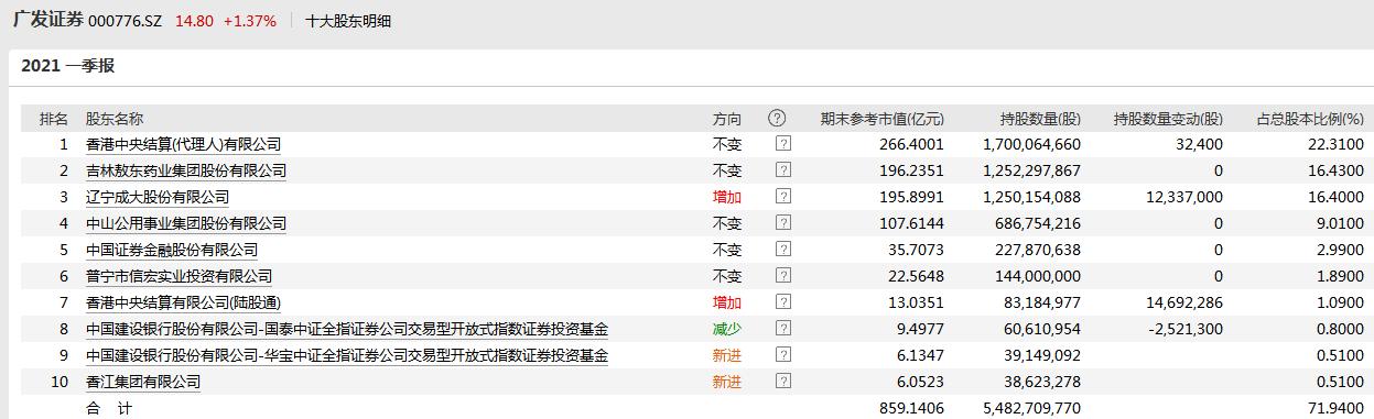 股东方面,广发证券2021年一季报显示,持股比例超过5%以上的股东共有4家。除香港中央结算(代理人)有限公司外,吉林敖东药业集团股份有限公司是广发证券的最大股东,持股比例为16.43%。辽宁成大股份有限公司紧随其后,持股比例为16.40%。中山公用事业集团股份有限公司的持股比例为9.01%。