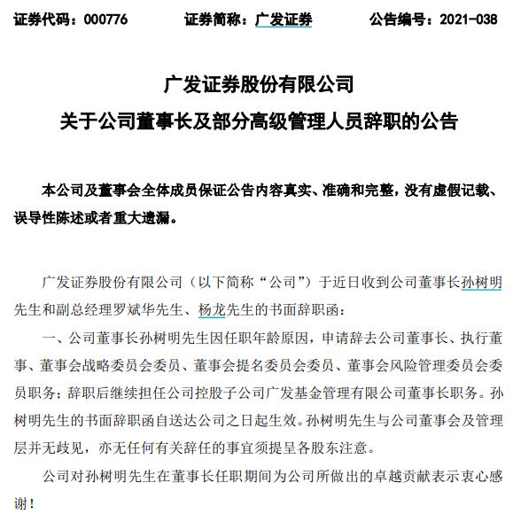 公告显示,孙树明因任职年龄原因,申请辞去广发证券董事长、执行董事、董事会战略委员会委员、董事会提名委员会委员、董事会风险管理委员会委员职务;辞职后他将继续担任公司控股子公司广发基金管理有限公司(简称“广发基金”)董事长职务。孙树明的书面辞职函自送达公司之日起生效。