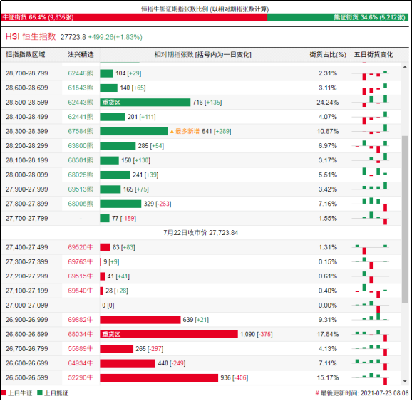 街货分布方面,周四,恒指牛证街货贴价区间主要在收回价26500点至27000点之间,累计相当约3370张期指合约;恒指熊证街货在收回价28100点至28600点,累计相当约1893张期指合约。