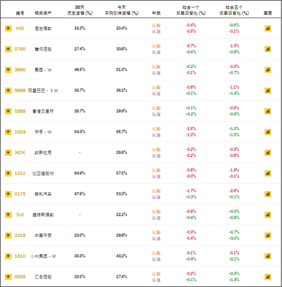周四恒指相关权证的平均引伸波幅报约20.4%。个股方面,快手相关认购证的引伸波幅按日显著调降2.5%;小米、腾讯相关认沽证的引伸波幅则按日小幅调升。