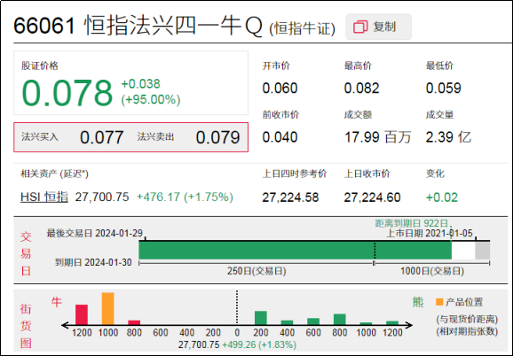 1、强势轮证:恒指法兴四一牛Q(66061.HK),周四上涨95%;