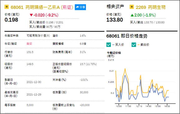 2、看错方向:药明瑞通一乙熊A(68061.HK),周四下跌9.2%。