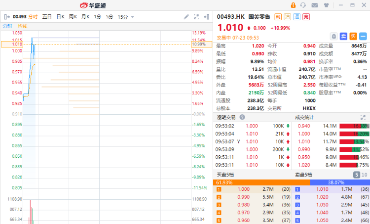 华盛资讯7月23日消息,国美零售昨日在港交所公告称与深圳市投控资本有限公司、怡亚通签署三方战略合作框架协议。今日早间,国美股价跳空高开,盘中一度涨逾11%,不断刷新月内新高。截至发稿,国美零售涨10.99%,现报1.01港元,最新总市值240.7亿港元。