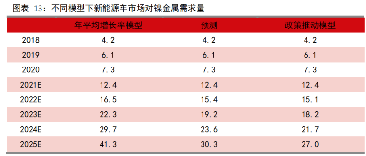 中信期货研究团队根据政策目标推算,2025年新能源车市场对镍需求量约27万吨,按复合增长率模型,镍需求量约41万吨。