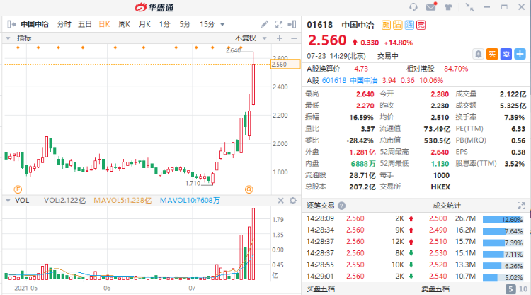 答案是有,那就是在7月23日受到利好推动盘中一度涨幅超过17%的中国中冶。