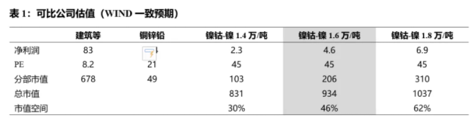 而根据中国中冶的镍钴铜矿产等分部估值模拟测算约46%左右市值提升空间: