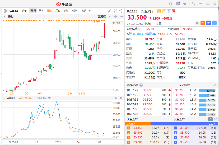 早盘长城汽车继续走高,截止发稿,H股涨6.01%,报33.5港元,股价高见33.75港元,总市值3060亿港元,成交额8.693亿港元。此外,长城汽车A股上涨7.39%,股价高见54.99元,刷新历史高价。