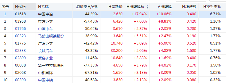 AH股方面,中国中冶H股涨17%,A股涨停;中国中车H股涨5%,A股涨8%;长城汽车H股涨5%,A股涨4%。