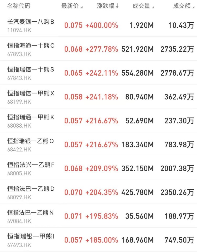 涨幅居前的包括:长汽麦银一八购B暴涨400.00%,占据排行榜第一,恒指海通一十熊C涨277.78%;恒指瑞信一十熊S涨242.11%。值得关注的是,恒生指数有28只熊证涨超100%(包含100%)。