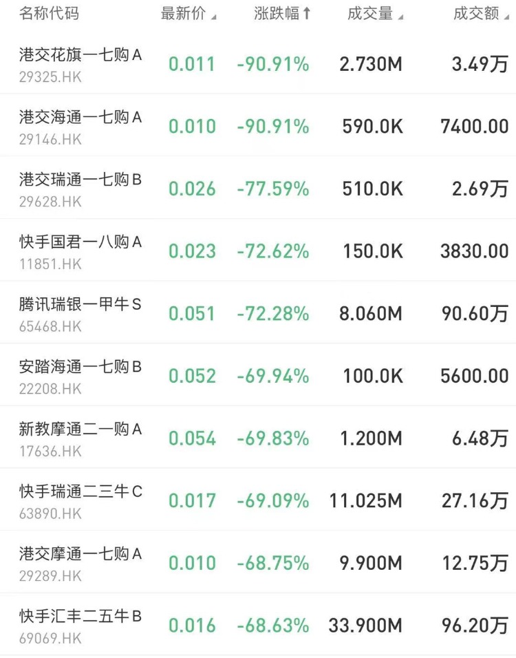 在今日跌幅榜中,港交花旗一七购A跌90.91%;港交海通一七购A跌90.91%。