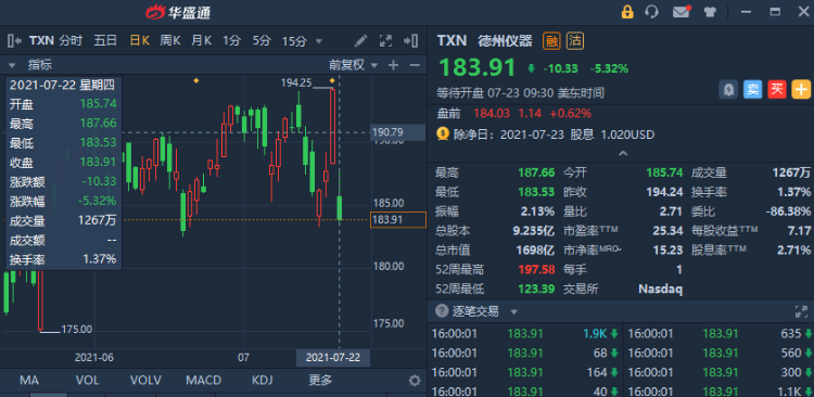 德州仪器(TXN)股价在周四交易中下跌5.32%,而PHLX半导体指数 (SOX)下跌1%,标准普尔500指数上涨0.2%,纳斯达克综合指数,上涨0.4%。
