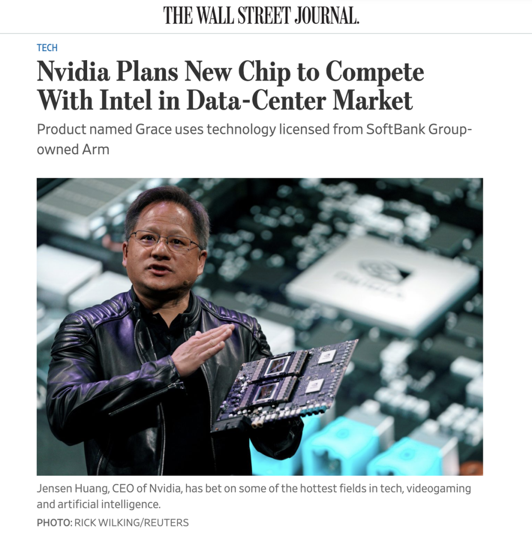 黄仁勋带领的英伟达也在眼馋英特尔数据中心的业务,推出服务这一市场的芯片。去年,英伟达已超越英特尔成为全球市值最高的芯片公司。