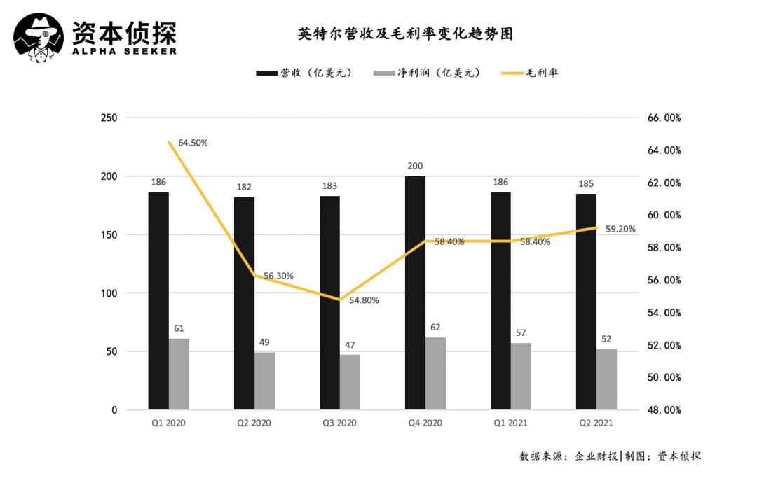 周四美股盘后,英特尔公布第二季度财报,其中营收达185亿美元,同比增长2%;每股摊薄收益为1.28美元,同比增长12%;均超华尔街预期。毛利润率为59.2%,较去年同期增长2.9个百分点,环比上升0.8个百分点,平稳上升,但仍未回到60%准线。净利润同比上升6%,为52亿美元。