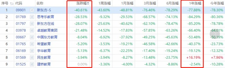 今日(7月23日),K12教育的港股标的股价以迅雷不及掩耳之势跳水,首当其冲的当然是新东方-S,一度腰斩50%,最终收跌40.61%,紧随其后是思考乐教育和新东方在线,一日跌去28.53%和28.07%。