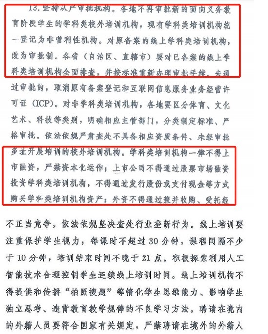 这份文件中的许多细则都对海内外上市的K12教育机构形成了巨大的压力,譬如:节假日休息日寒暑假不得组织学科培训;学科培训机构不得通过任何形式上市、严禁资本化运作; 各地不再审批新的面向义务教育阶段学生的学科类校外培训机构;现有的义务教育阶段的学科类培训机构统一登记为非营利性机构等关键内容。