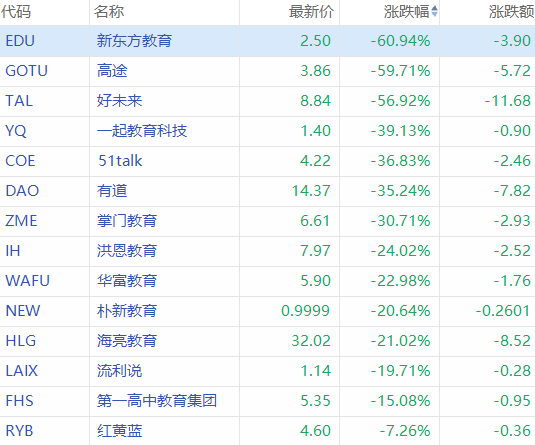 截至发稿,教育股方面,好未来临时停牌,停牌前跌53.07%,现跌56.92%;新东方教育跌60.94%,高途跌59.71%,一起教育、51talk、有道、掌门教育均跌超30%;