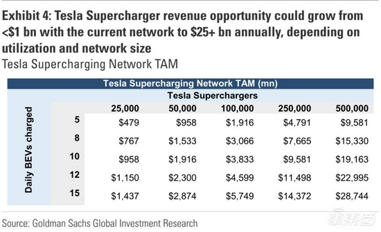 高盛公司在评估完特斯拉现有的充电站数量和建设速度之后,推算出此举将会每年为特斯拉创收250亿美元(约合1600亿元人民币)。