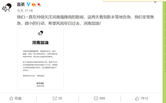 据喜茶官微,喜茶刚刚紧急第二次捐款600万元用于河南各地的抗汛救灾、灾后重建,希望风雨早日过去,此前喜茶捐款500万。