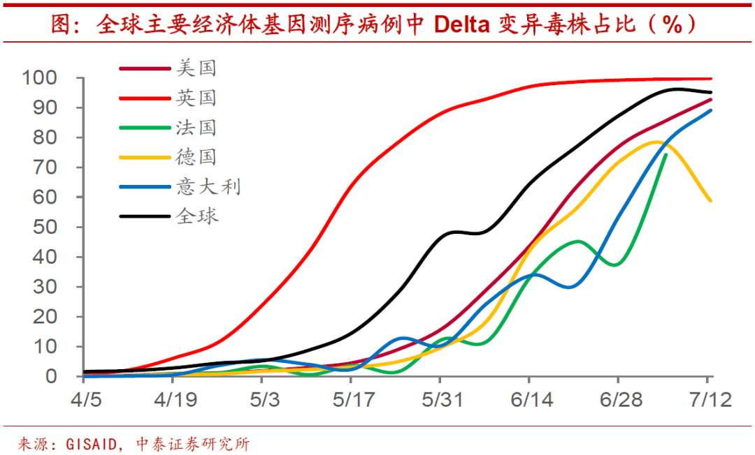 在这轮全球疫情抬头的过程中,Delta变异毒株的扩散起到了不容忽视的作用。根据世界卫生组织的数据,截止7月20日,Delta变异毒株已在全球超过120个经济体出现。Delta变异毒株的扩散速度委实惊人。
