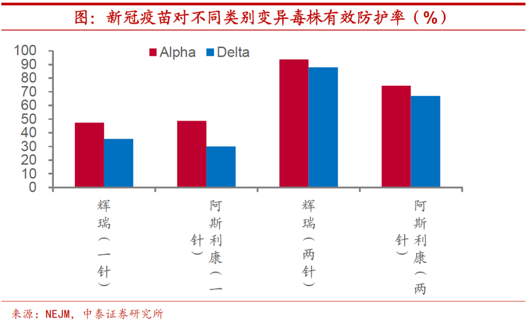 疫苗仍有防护作用,完全接种效果更好。从发达经济体接种的新冠疫苗种类上来看,辉瑞疫苗占据主流,阿斯利康和莫德纳也占据一定比例。根据《新英格兰医学杂志(NEJM)》发布基于英国病例的最新研究,在接种一针之后,现有疫苗对于Delta变异毒株的防护效果不如Alpha变异毒株,但在接种两针之后,疫苗对于两种变异毒株防护效果的相差不大。